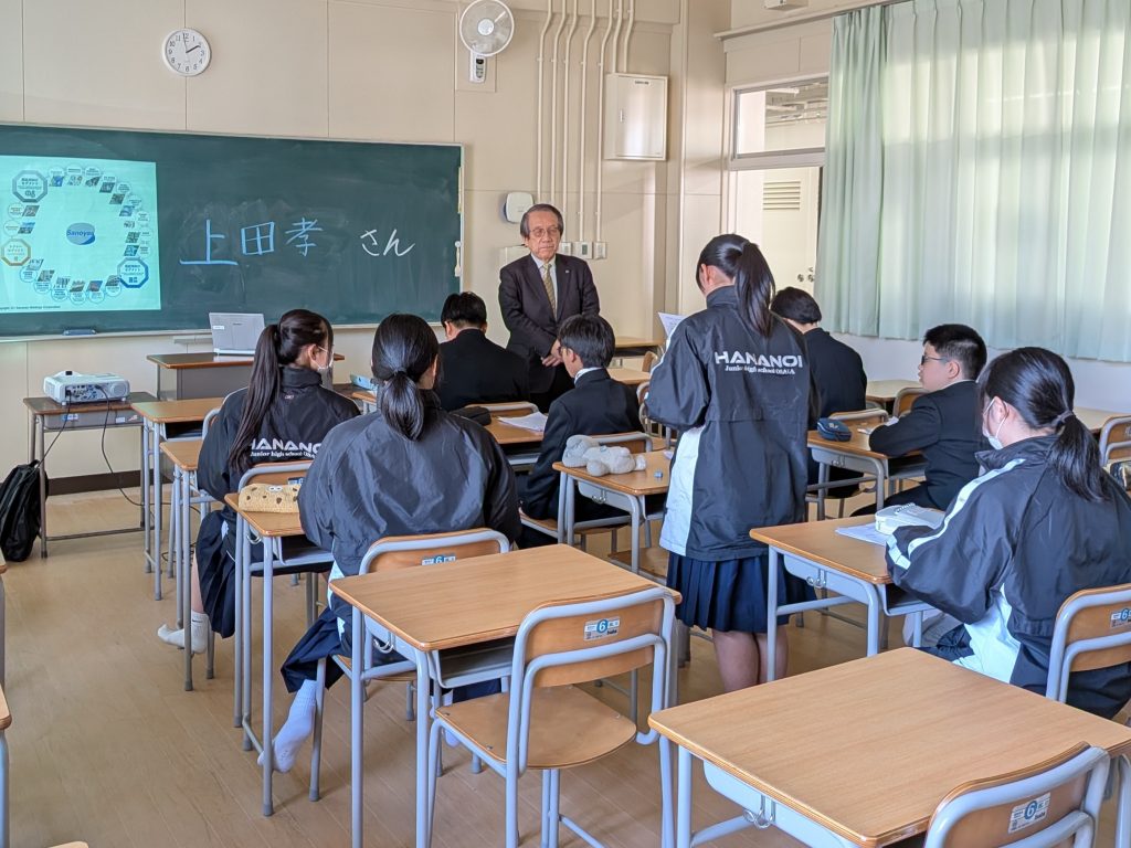 大阪市立花乃井中学校で当社代表取締役会長 上田 孝が「出前授業」を実施しました
