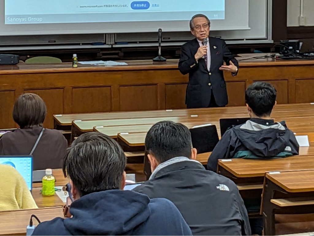 90分の講義時間で「中堅・中小企業連邦経営」を掲げるサノヤスのビジネスモデルに関する解説を交えながら、銀行時代から現在までの自身のキャリアを振り返り、人との出会いやエピソード、そして自身の経営哲学へと話を展開しました。また、質疑応答の時間では「会社経営をはじめとしたビジネスの第一線で長く活躍する秘訣」「大きな決断をする際に大切にしていること」「シニア、若手を含めた人財活用に対する考え方」といった鋭い質問を受け、それらのテーマで活発な意見交換が行われました。講義の締め括りにあたり、母校で学ぶ約70名の受講生に向けて「それぞれの会社を超えて、日本の発展に資する人財になってほしい」と力強いメッセージを送りました。